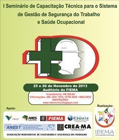 São Luís – Em parceria com a Federação das Indústrias do Estado do Maranhão (Fiema), Vale e CREA-MA, o Instituto de Desenvolvimento do Estado do Maranhão (Idema) realizará nos dias 25 e 26 de novembro, no auditório Alberto Abdalla, na Casa da Indústria Albano Franco (Retorno da Cohama), o I Seminário de Capacitação Técnica do Sistema de Segurança do Trabalho e Saúde Ocupacional.