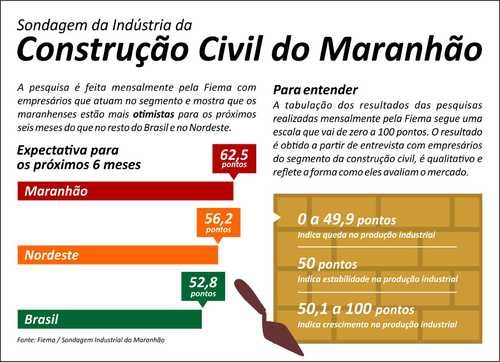 Quanto a produção do segmento, a Sondagem da Indústria da Construção Civil do Maranhão mostrou que houve ligeira retração, com o indicador ficando 49,3 pontos, porém a boa notícia é que foi 2,9 pontos maior do que o indicador para o mês de outubro de 2013, que marcou 46,4 pontos, o que indica viés de crescimento e justificaria o otimismo dos empresários com os próximos seis meses.