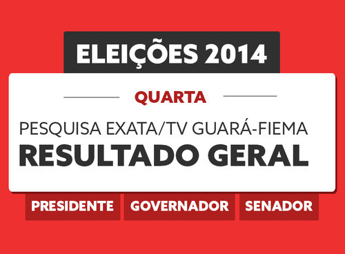 São Luís - A parceria entre a Federação das Indústrias do Estado do Maranhão (Fiema) e a TV Guará divulgou nova Pesquisa de Intenção de Voto para as Eleições de 2014. A sondagem foi realizada pelo Instituto Exata entre os dias 23 e 28 de agosto, quando foram ouvidas 1.400 pessoas em 45 municípios maranhenses escolhidos aleatoriamente, mas contemplando as quatro regiões do estado e a ilha de São Luís.