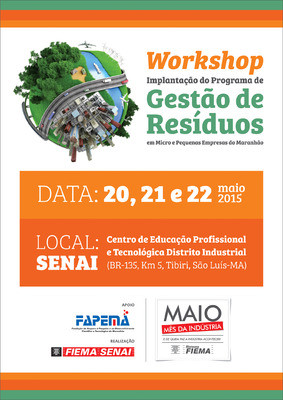 SÃO LUÍS - O Serviço Nacional de Aprendizagem Industrial, uma das entidades do Sistema FIEMA, realiza no período de 20 a 22 de maio de 2015, o 1º Workshop Implantação do Programa de Gestão de Resíduos em Micro e Pequenas Empresas do Maranhão. A ação é destinada a empresários, profissionais e alunos de nível médio e superior.