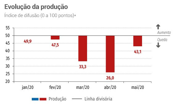 A produção e o emprego sofreram novas quedas no mês de maio na comparação com o mês anterior, ainda sob os efeitos da pandemia de Covid-19. Mas a queda é menor. O índice de evolução da produção subiu de 26 pontos em abril deste ano para 43,1 pontos em maio. O fato de estar abaixo de 50 pontos indica queda e quanto mais próximo de 50, menor e menos disseminada é a queda. Nessa metodologia, o índice varia de 0 a 100. Só há crescimento quando os dados aparecem acima de 50.