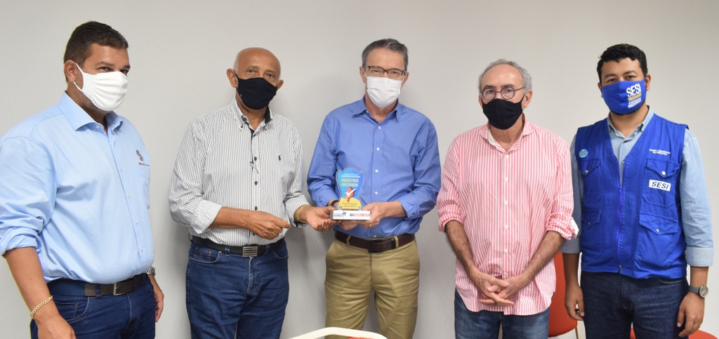 PREMIAÇÃO – Além da revisão tarifária 2021, na reunião também foi apresentado o novo diretor presidente da Equatorial no Maranhão, Servio Túlio dos Santos que na oportunidade foi agraciado pelo presidente da FIEMA e diretor regional do SESI, Edilson Baldez, pelo vice-presidente da FIEMA, Fábio Nahuz e pelo superintendente do SESI, Diogo Lima com um trófeu de indústria vacinada contra a Covid, por alcançar índices acima de 90% de imunização feita pelo SESI.