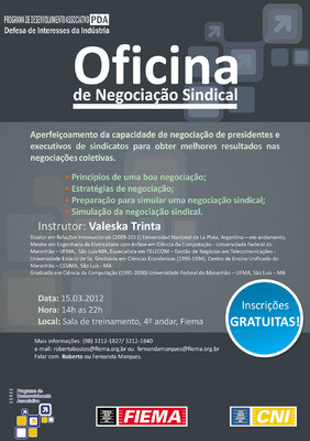 SÃO LUÍS - Como estratégia de aperfeiçoamento da capacidade de negociação de presidentes e executivos de sindicatos para obter melhores resultados nas negociações coletivas, a Federação das Indústrias do Estado do Maranhão (Fiema), por meio do Programa de Desenvolvimento Associativo (PDA), oferece nesta quinta-feira, 15 de março, aos seus associados e à comunidade, a Oficina “Negociação Sindical”. A participação é gratuita.