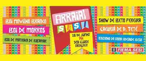 São Luís - O colorido das bandeirinhas e o tradicional som das matracas e pandeirões juninos animarão o Sesi Clube Araçagy no dia 28, a partir das 19 horas. Promovido pelo Serviço Social da Indústria (Sesi), entidade integrante do Sistema Fiema, o Arraial do Sesi 2012 – São João de todos os Sotaques – promete muita dança e música com o Cacuriá de Dona Teté, Boi de Matraca de Ribamar, Boi Novilho Branco, Boi de Morros, Boizinho do Anna Adelaide Bello e Show de Beto Pereira. A festa é aberta aos trabalhadores da indústria, alunos, professores e comunidade.
