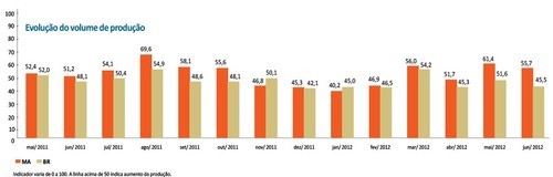 O resultado da Sondagem Industrial no Maranhão foi melhor do que o registrado para o Brasil e para o Nordeste. O indicador nacional ficou em 45,5 pontos, enquanto o indicador regional ficou em 48,5 pontos e mostrando que houve queda na produção industrial.