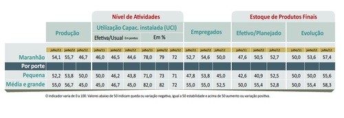 Em todos os portes da indústria maranhense houve aumento (57,4 pontos) dos estoques de produtos finais em julho quando comparado a junho, situando-se acima do planejado. Mesmo com recuo na produção, os postos de trabalho foram mantidos conforme indicador de 50 pontos (indicador de estabilidade).