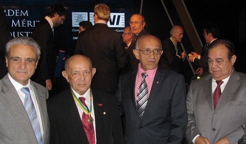 Andrade é um dos 11 industriais brasileiros que receberam a honraria no encerramento do 7º Encontro Nacional da Indústria (Enai). Na foto, o presidente da Fiema (2º a dir) e o industrial homenageado (2º á esq) em companhia do presidente da CNI, Robson Braga (1º a esq) e do vice presidente da Fiema, Francisco Sales (1º a dir).